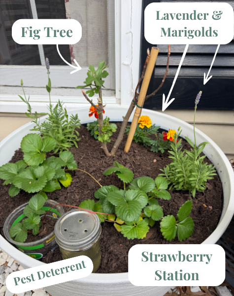I added some lavender and marigolds to deter pests along with a DIY mixture of water, apple cider vinegar and dish soap to trap any bugs who get too close to my fruit