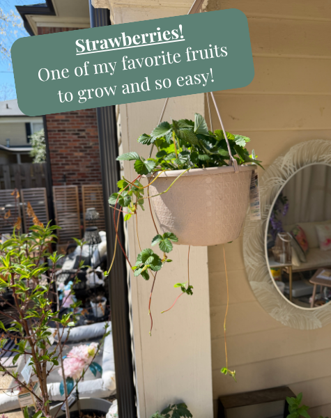 So you may be asking “what is with all the strawberries??” Well, I’m obsessed with them so having a bunch of plants for consistent strawberry access is definitely a personal preference but also, they grow like weeds when they’re happy! I bought this basket and two small strawberry plants that were already growing into one another, but after all the runners are planted and clipped from the mother plant, I will have 13 strawberry plants! I’m telling you, they grow like weeds. Keep that in mind when buying one.